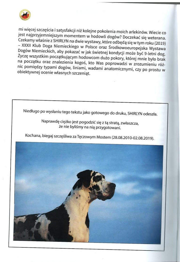 If I were ask again about to breed dogs and if yes, what breed, I can’t imagine what would give me more happiness and satisfaction than the next generations of my harlequins. Do you know what’s the most pleasant moment when it comes to breeding great danes? It’s to live to see the veteran. We are waiting for two shows with SHIRLYN. They will take place in 2019 – 32nd Club of Great Dane in Poland and Middle-European Show of Great Danes. We are waiting for the shows to prove in how good of shape and condition can a 9 year old Great Dane be. I wish a lot of lowliness to beginner breeders, of which I lacked at the start. I wish you would find someone who will guide you and help you to understand the differences in great danes types, lines, anatomical flaws. I wish you impartial perspective on your puppies.